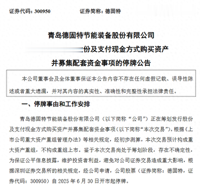 近日,青岛德固特发布公告称,公司正在筹划以发行股份及支付现金方式购买浩鲸云计算科技股份有限公司(下称“浩鲸科技”)控制权,并同步募集配套资金。此次交易预计构成重大资产重组,公司股票自6月30日开始停牌。